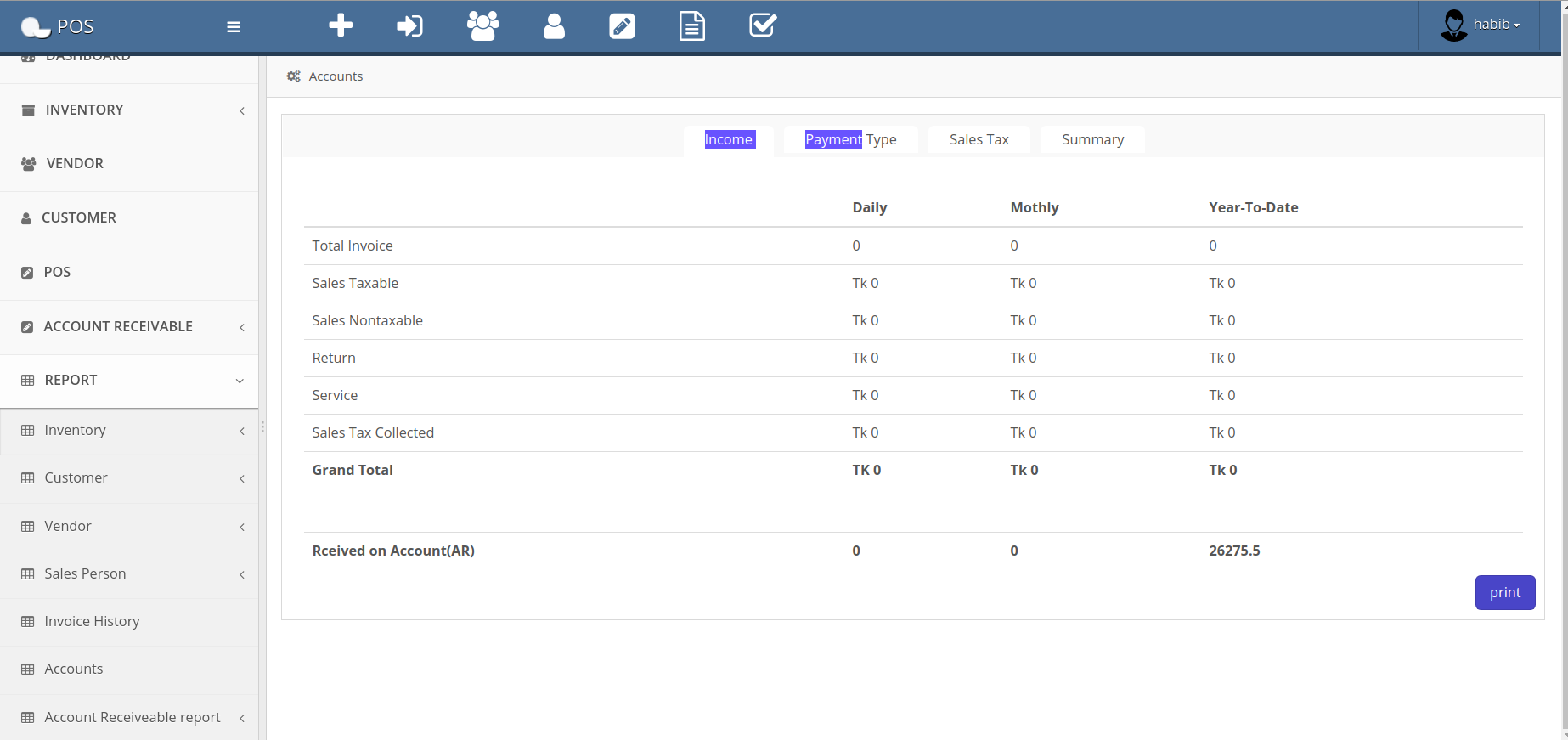 In Account report you will get all kinds of account report on the basis of daily, monthly and yearly.For example collection in taxable and nontaxable product sales, collection in cash and accoount receivable, invoice summery etc.